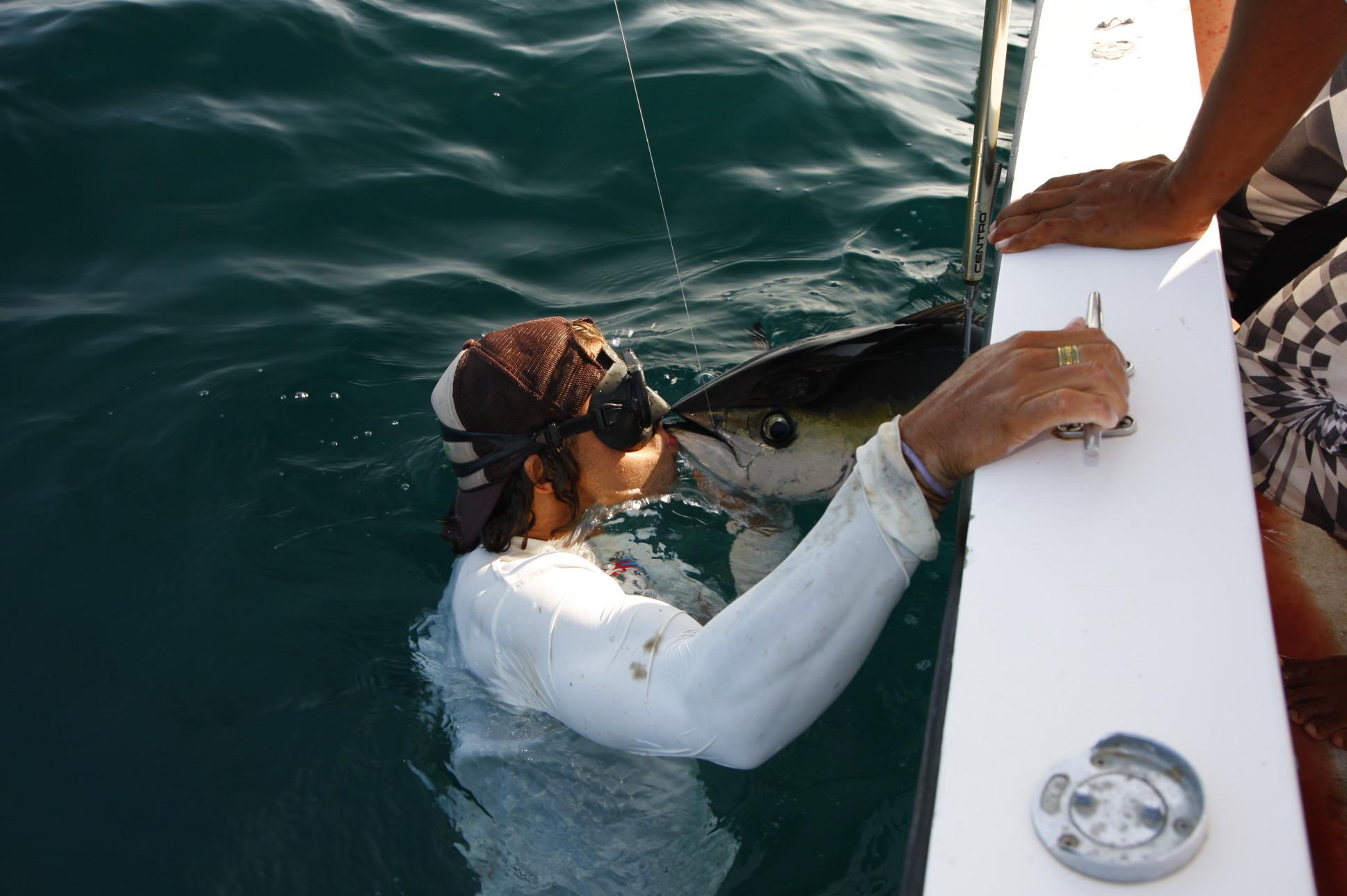 I was just looking through some photos from last season and I cam across a couple that I thought were hilarious. We had some fly fisherman come down and Pete shot some awesome underwater footage for them. Anyway, Morten battled this tuna on fly for over an hour. It ended with a kiss and a homemade bat made by our cook!